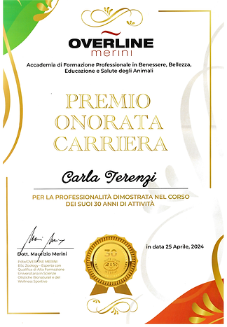 Nonostante le difficoltà, il valore del lavoro e la dedizione di mia madre non passarono inosservati. A coronamento di 30 anni di attività, Carla ricevette il prestigioso Premio Onorata Carriera il 25 aprile 2024 dall’Accademia “Overline Merini”, consegnato dal dott. Maurizio Merini per il suo straordinario contributo al mondo della toelettatura. Questo riconoscimento non solo premiava la sua carriera professionale, ma celebrava anche la sua capacità di toccare la vita di tante persone con la sua gentilezza e professionalità.